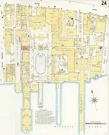 Reynolds announced plans in July 1903 for an amusement park rivaling Luna Park, which was to be built in a style resembling London's Hippodrome.[12][13] According to local media, he reportedly paid $180,000 for a pier on the Coney Island Beach,[14] as well as $447,500 for two parcels at Surf Avenue and West Eighth Street,[lower-alpha 1] measuring 800 feet (240 m) deep and 262 feet (80 m) wide.[13][14] The Times Union subsequently said that the purchase prices for the site were not correct.[16] The Surf Avenue parcels had belonged to John Y. McKane,[13] who had operated a bathing house on the site.[17][18] Previously, the parcels had also included the Coney Island Athletic Club's arena[16] and the Culver Depot, the then-terminal of what is now the New York City Subway's Brighton and Culver lines.[16] Although C. L. Turnbull and P. I. Thompson were nominally the buyers, but they acted as proxies for Reynolds, allowing him to acquire the Surf Avenue site at a discount of more than $50,000.[19] Once Reynolds acquired the site, he made a deal with the New York City Board of Estimate to demap West Eighth Street, which separated McKane's parcels from each other.[15] The street, which had taken up one-sixth of the proposed park's width, contained a trolley terminal that needed to be relocated.[15]