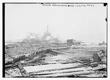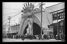 Many of the park's shows were replaced for the 1906 season, and park officials also rebuilt the pier.[42] The new attractions for that season included a reenactment of the 1906 San Francisco earthquake's aftermath; a Moqui Indian village; a rebuilt Creation show;[42][43] and the Touring New York car show.[44] The park opened for the 1906 season on May 20,[42] and it began hosting vaudeville shows for the first time that June.[45] Dreamland's third season ended on September 24, 1906.[46] Prior to the 1907 season, concessionaire William Ellis introduced an attraction called the Orient, anchored by a theater that presented several shows.[47][48] Park officials also built a new administration building and installed other shows.[49] Park officials gave $50 to the first guest of the season on May 18, 1907,[49][50] and the park operated through September 21 of that year.[51] At this point, the park hosted several shows that were based on themes of morality,[52][53] such as "The End of the World" and the "Feast of Beshazzar and the Destruction of Babylon".[48][54]