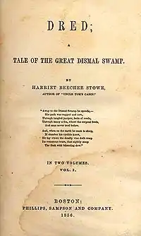 Dred: A Tale of the Great Dismal Swamp is the second popular novel from American author Harriet Beecher Stowe. It was first published in two volumes by Phillips, Sampson and Company in 1856. Although it enjoyed better initial sales than her previous, and more famous, novel Uncle Tom's Cabin, it was ultimately less popular. Dred was of a more documentary nature whereas Uncle Tom's Cabin had much stronger characters.