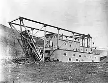 The Canadian Klondyke Mining Company built the Twelve Mile ditch in 1909, which would supply the water to operate hydraulic monitors on dredges.[6] It also built dams and ditches to generate hydroelectricity, and by 1911 the 7,500-kilowatt (10,100 hp) North Fork Hydro Power Plant was operational about 50 kilometres (31 mi) from the dredges it energized.[7][6][8]