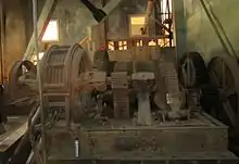 The crew who operated the dredge consisted of various positions. The dredge master was responsible for ensuring the productivity of the dredge, and would also serve as winter watchman.[18] Among the position's activities were documenting crew hours and breakdowns, and preparing a dredging plan for the area to be excavated.[19] The winchman operated the dredge from the master control room, taking over for the dredge master on the evening and night shifts.[19] Among the winchman's tasks were supervising the crew and operating the digging ladder.[19] An oiler lubricated and maintained all moving parts, including pumps, motors, tumblers, and the main drive, and replaced worn parts, also substituting for the winchman at times.[19]