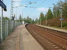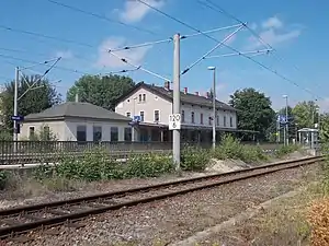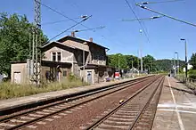 Of the six Freital stations, Freital-Potschappel station is the most important.[29] The Niederhermsdorfer Kohlezweigbahn ("Niederhermsdorf coal branch railway") branched off here to two coal shafts from 1856 onwards. Its route was used in the construction of the 750 mm gauge Potschappel–Wilsdruff railway opened in 1886. Extensive goods and transhipment facilities were built In Potschappel, which were further expanded during the elevation of the line and its quadruplication after 1900.[30]