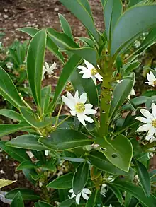 Drimys andina is an evergreen shrub, which grows from 0.5 to one meter tall and broad. The leaves are long, oval, and leathery. It flowers in summer, with white, star-shaped scented flowers growing in terminal clusters.[2]