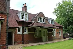 The exact date of construction is unrecorded, but it is likely that Droxford station was built in 1902.[23] As with other stations on the line, the station building was designed by T. P. Figgis, an Irish architect who had designed many of the stations of the City and South London Railway (later to become part of London Underground's Northern line).[22] All the new stations for the line were of a very similar Tudor Revival design, built largely of red brick with Portland stone stonework, stained glass windows and lavatories in the shape of pagodas.[22]