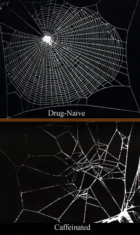 An image comparing the web of a drug-naïve spider to that of a spider having been given caffeine.