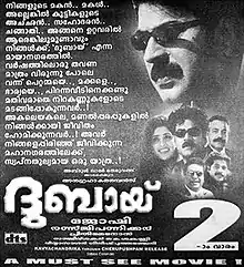 Dubai is a 2001 Indian Malayalam-language political action thriller film directed by Joshiy starring Mammootty, N. F. Varghese, Biju Menon and Nirmal Pandey. Anjala Zaveri, Vijayakumar, Cochin Haneefa, Janardhanan, Nedumudi Venu and Preetha Vijayakumar play supporting roles. The script for the film was written by Renji Panicker. It received negative reviews from the critics and was a failure at the box office.[2]