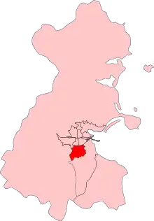 It extended west into the middle of the county. The constituency was bounded by the city of Dublin to the north, North Dublin to the west, the Pembroke division of County Dublin to the south.[5]