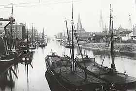 According to recent research, around the year 1000 the Rhine shifted its course westwards. Duisburg found itself no longer lying directly on the Rhine; it remained connected to the river only through a "dead" arm of the Rhine for the following 400 years. As a result, this previously important trading town declined into a small agricultural settlement. It was only in the 19th century that an initiative to resurrect the connection to the Rhine proved successful. Initially, the Outer Harbour was dug from the Rhine in the west as far as the contemporary Marientor Bridge, to which an eastern extension was later built, the Inner Harbour. Early on, the timber industry established itself on the harbour, mining interest being a major customer for their products then, as modern production methods were able to reduce their space requirements, grain mills began to establish themselves in several locations, along with their warehouses for storage. They conferred on the Inner Harbour the nickname "bread basket of the Ruhr district", supplying the rapidly growing population in the district.