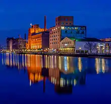 The Innenhafen (Inner Harbour) in Duisburg, Germany, is connected to the Rhine River, encompasses an area of 89 hectares (220 acres). For over a hundred years during the high point of the Industrial Revolution, it was the central harbour and trading point of the town. Since the mid-1960s, the importance of the harbour declined and it lay in a disused condition for 20 years, before plans for renovation were drawn up. This former industrial area has been fundamentally transformed, a process which started as a part of the International Building Exhibition Emscher Park (IBA) which ran from 1989 until 1999.