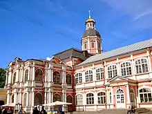 The Dukhovsky wing of the monastery, linking the Holy Trinity Cathedral and the Annunciation Church, was designed by Domenico Trezzini in the Petrine Baroque style.[1] Construction began on the Annunciation Church end of the building in 1717, and was completed in 1725 by Leonard Theodor Schwertfeger.[2] The ground floor held meeting rooms and monastic cells, the upper storey contained halls, the rooms of the governor, and more cells.[2] Plans for a new church to ease the overcrowding in the Annunciation Church had been under consideration since 1817, and in 1819 the halls adjacent to the Annunciation Church were combined into a single two-storey hall, with altar in its eastern part.[2][3]