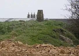 ![]() The Trig point at the top of Dundry Hill with the top of the tower of Church of St Michael, Dundry in the background | |