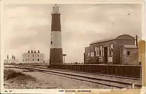Dungeness was the terminus of the Lydd Railway Company's branch from Appledore which opened on 7 December 1881. Passenger services initially terminated at Lydd, although a goods service operated as far as Dungeness. The line was opened throughout to passengers as from 1 April 1883. A second branch was opened the following year from a point just south of Lydd to New Romney. The railway terminated almost at the foot of Dungeness lighthouse (1901) where very basic facilities were provided in the shape of a single platform on which was perched a small arched roof weather-boarded shed comprising a ticket office, waiting room and ladies and gents toilets. A run-round loop was provided to facilitate engine reversals and a siding led to the lighthouse.[2]