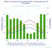 Dworshak's climate is classified as Warm-summer Mediterranean climate (Köppen Csa). Among them, the annual average temperature is 51.7 °F (10.9 °C), the hottest month in July is 72.2 °F (22.3 °C), and the coldest month is 33.3 °F (0.7 °C) in December. The annual precipitation is 26.10 inches (662.9 mm), of which November is the wettest with 3.23 inches (82.0 mm), while August is the driest with only 0.68 inches (17.3 mm). The extreme temperature throughout the year ranged from −22 °F (−30 °C) on January 21, 1937 to 118 °F (48 °C) on July 28, 1934.