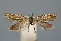 The wingspan of the moth ranges from 9–14 mm. The wings are metallic gold with sapphire-blue and ruby-red dots (strigulae) and an indistinct obscurely paler dorsal spot before tornus. The hindwings are brassy-grey, posteriorly purplish-tinged and like the forewings have grey cilia. The head is ochreous-grey-whitish mixed with dark fuscous.[2] The moths are on the wing in April and May, fly on sunny days and come to light. On dull days they rest on the trunks and branches of oak. They do not feed.[3][4][5]
