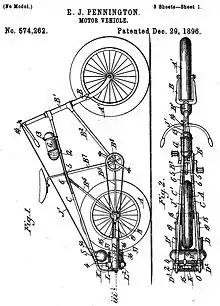 E.J. Pennington is probably best known today for his pioneering motorcycles.[3] He is sometimes credited with having invented the word "motorcycle"; he used the term as early as 1893. Pennington built and demonstrated his original motorcycle design in Milwaukee in 1895. Apparently not finding any backers for his idea he took it to England where he sold the patents for it to Harry John Lawson's The Great Horseless Carriage Company Limited in 1896 and joined that company's board of directors. Lawson had two more prototypes built[4] but nothing further came from the design. Pennington made many claims for his motorcycle, but it is doubtful if any of them are true. The design was very primitive and a few journalists of the time expressed doubts as to whether or not it would even run, though The Autocar reported in June 1896: "...although the motor required some little alteration, the speed developed was said to have varied from thirty to forty miles per hour."[5] Notable features were that the engine's cranks were connected directly to the rear axle, the cylinders had no cooling fins, and Pennington made use of balloon tires - an invention he is also often credited with.[6]