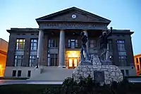 The original Doughboy statue was completed in early 1921 and erected in the middle of Marion Avenue just behind its current location in late July or August 1921, but was left veiled until late 1923 when payment for the sculpture and impressive base was finally received.[13] Hundreds of mass-produced replicas were installed in front of American city halls and courthouses and in public parks and cemeteries. The exact number may never be determined, but there are approximately 140 extant today, in 38 different states. A total of 153 are listed in the SIRIS database, though some have been destroyed by weather, accidents, or vandalism, and some, unfortunately, are listed in error, and usually turn out to be John Paulding's very similar statue "Over the Top".[14][15]