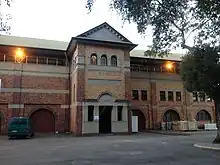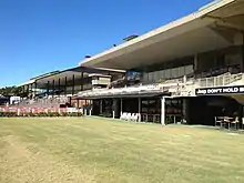 Further to the west again is the 1925 three-storey rendered brick Members' Stand, attached to which is the Camera Tower. Nearby is the Judge's Box (1963). A range of original timber fittings and fixtures remains throughout this building.[28] Adjoining the stand and connected by an upper level walkway is the 1950s John Power Stand. Both of these stands overlook the parade ring and saddling area. The John Power Stand is constructed primarily of reinforced concrete and its form and detail are typical of architecture of the period. Unlike the other stands the roof of the John Power Stand is also an open, cantilevered viewing area with tiered seating.[29] The base of this building accommodates ticketing booths, a bar and refreshments area, public seating and open space for bookmakers.[1]