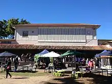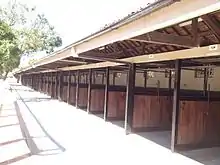 Located at the far western end of the site is a collection of five timber race day stalls and stables. Entry to this part of the site is via a secondary access from Gordon Street marked by two white rendered masonry pillars. Apart from this point of access there are a number of secondary entrances into the site from the roads bounding the course. The stable buildings are simple partially open timber structures with gable roofs. The external walls are generally clad with weatherboards on the ends, while the rear long walls are partially in-filled with battens. The stalls are formed with half-height timber-framed walls with timber boarding infill. The roofs are clad with corrugated asbestos cement sheeting. A number of brick, fibrous cement and corrugated iron-clad additions have been made throughout this complex.[30] A concrete apron slab surrounds these structures.[1]