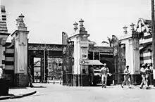 During World War II, the Club's regular race meetings continued until December 1941 when Australia faced the threat of invasion by Japan. Military authorities took over the racecourse on 19 December 1941. Until 1946, Eagle Farm Racecourse was known as Camp Ascot, occupied by thousands of Americans. The first contingents of American servicemen from the Pensacola Convoy[12] marched from Bretts Wharves down Racecourse Road and through what has since been termed "The Gateway to Victory" in December 1941. In the early 1940s, eight "igloo" stores were erected at Eagle Farm Racecourse for the Australian and United States Armies. Throughout World War II, the QTC conducted races at Albion Park, the Victory Cup Meeting in May 1946 marking the return of racing to the Eagle Farm Racecourse.[1]
