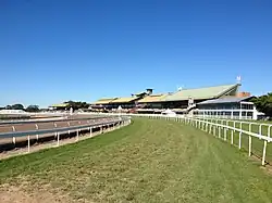 Racecourse developments since 1963 have taken several forms. In 1969 a new kikuyu grass training track, aluminium running rails, horses' swimming pool, state-of-the-art testing facilities for the Laboratory, covered betting ring and opening of the famous Guineas Room – a restaurant situated on the second level of the Members' Stand (John Power Stand) – were added.[15] In 1990 there was major track extension between the 1,600-metre (5,200 ft) and the 1,200-metre (3,900 ft) and the QTC acquired several properties bordering the 1,600-metre (5,200 ft) up to the 1,400-metre (4,600 ft) starts. The new 1,600-metre (5,200 ft) start was used for the first time in February 1991.[16] Restoration of the old Totalisater building in 2006 and relocation of the Racing Museum there took place some time afterwards.[17] Prolonged drought led to the existing dam being expanded, a new dam excavated and a fence and underground water tanks installed in 2008.[18] There was upgrading of Eagle Farm in 2005 with work undertaken to the St Leger Stand and lawns and setting up of the Champagne Bar facing the mounting yard as a temporary measure until permission was granted for the permanent addition in 2006.[1][17]