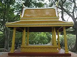 In May 1967, the Thai Pavilion, a gift of King Bhumibol Adulyadej and Queen Sirikit of Thailand in 1964, was assembled just in time for King Adulyadej's dedication of the pavilion on June 6, 1967; it is located between Lincoln Hall and Jefferson Hall, in front of Hale Kuahine.[21]