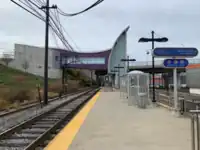 In 2009, RTA began a complete renovation of the station as it had not received any significant improvements since its original construction and was not accessible compliant. The rebuilt station opened in 2011[7] and includes a new headhouse built on the northeast corner of East 55th and Bower Ave attached to a new parking lot and bus loop. From the headhouse, a bridge extends over the eastbound rapid tracks to a stairway and elevator leading to a single, central island platform. After reaching the platform, passengers may proceed forward to the west and walk up a ramp to the high level Red Line platform, or may turn and walk east to the low level Blue/Green Line platform. Passengers may also walk from one end of the platform to the other to switch from the Red Line to the Blue/Green Line or vice versa.