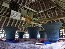 The bells are exceptional in that they are not rung from below by ropes attached to wheels, as is usual in change ringing, but the headstock is manipulated by hand by ringers standing beside the bells.[2]