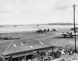 The airfield's facilities included a single runway 5,100 feet (1,600 m) x 150 feet (46 m) running east to west (as of December 1944). An extensive taxiway and revetment area was located to the south of the airfield and north of the runway. Tower code was named 'Violet'. Operational units assigned to the station were initially P-47 Thunderbolt fighter squadrons of the 318th Fighter Group which moved in from Hawaii in early July to support ground combat units in the Marianas. Also, the 6th Night Fighter Squadron operated P-61 Black Widows to provide night fighter defense against Japanese night air attacks.