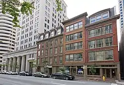 The former headquarters Cincinnati Gas & Electric Company, completed in 1929,[2] although not a contributing property, stands next door to the cluster of buildings at the southwest corner of Fourth and Main streets. Its tower can be seen in the left side of the image.