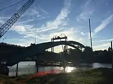 The predecessor to the current bridge was located in Sheet Harbour, in the eastern area of the Halifax Regional Municipality, along the Eastern Shore. It was a green steel arch bridge, and was built in 1956 over the Northeast Arm of Sheet Harbour. It had a half-through, two-hinge type arch, as well as a built-up box-cross section for support.[5][6] The bridge was 213 metres (699 ft) in length, with a main span of 140 metres (460 ft).[1][5] The bridge had engineering ties with the Angus L. MacDonald Bridge in Halifax. The deck carried the two lanes of Trunk 7 and by extension the Marine Drive scenic route, and was hung from the arch by vertical steel wide flange shape hangers. The ribs of the bridge were heavily reinforced in 1988.[6] As the bridge neared the end of its lifespan, it was replaced by a new bridge with the same name. Unlike the old bridge, the new bridge was designed without overhead steel arches that would have doubled the cost.[3]