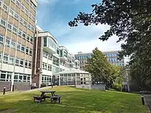 The design involved a three winged structure joined by a north-facing entrance block; each of the three wings had a continuous band of glazing on each of the six floors with flintwork panels above and below the glazing.[5] The two-storey entrance block featured a glazed entrance on the first floor with a large decorative panel designed by William George Mitchell on the second floor extending right across the entrance.[7] The abstract design of the 12 meters (39 ft) wide decorative panel, which was made from coloured fibreglass, was intended to recognise the diverse activities of the county council.[8][9] Although most county council departments were co-located at St Anne's Crescent, the chief executive's department and the legal and community services department remained at Pelham House; the county council also continued to use the council chamber at Pelham House for full meetings of the county council for the rest of the 20th century.[3]