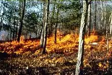 The oak-hickory forest of the Northeast was primarily burned by Native Americans, resulting in oak openings, barrens, and prairies in the Northeast and the Piedmont of North Carolina. There was nearly annual burning throughout the Northeast.[7] After the death of 90% of the native population around 500 years ago, grasslands, savanna, and woodlands succeeded to closed forest. After European settlement of the region the burning frequency was 2–10 years, with many sites burned annually.[1][6][7] The practice was so common that a North Carolina law in the early 18th century required annual burning of pastures and rangelands every March.[1]