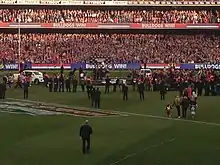 Wood obtained premiership victory as a replacement captain in the successful year of 2016. Wood was named as vice captain at the beginning of the year.[37] In Round 2 of the 2016 AFL season, Bob Murphy injured his ACL, resulting in him missing out on the rest of the season. Wood was named to replace the injured Robert Murphy as the captain of the Bulldogs,[38] and in this capacity led the club to premiership success in the 2016 AFL Grand Final over the Sydney Swans.[39] Wood played 20 games in the 2016 AFL season. He broke his disposal record against Fremantle in Round 1, collecting 23 disposals, as well as 5 marks and a tackle. He had one of his best games in his career against Collingwood in Round 10, kicking 1 goal, taking 13 marks and collecting 21 disposals,[40] one of the Bulldogs best on ground. Wood found luck in the newly introduced finals bye, as Wood suffered a minor injury in Round 22 and was close to missing out on the elimination final against West Coast, but because of the extra week had more time to recover and was able to play.[41] Wood played all finals games and captained the Bulldogs to their 62-year-drought breaking premiership. However, Easton Wood did not make the Top 10 of the Charles Sutton Medal voting.