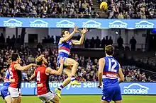 In 2017, Wood returned to his role as vice captain after Bob Murphy recovered from his injury and continued playing.[42][43] Wood played 18 games, and continued to prove his reputation as a dangerous intercept player, leading the Bulldogs in intercept possessions, averaging 5.9 per game over his season.[44] He had one of his best games of the season in the Dogs 7-point loss against West Coast in round 15 of the 2017 AFL season, collecting 21 disposals, gathering 4 tackle and taking 8 marks.[45] A hamstring injury obtained in the Bulldogs's 14-point win over Brisbane Lions in the 20th round of the season ruled him out for the remainder of the season.[46][44] Wood signed a three-year contract in June, keeping him at the club until 2020.[47] Despite missing out on 4 rounds, Wood came 4th in the Charles Sutton Medal count for 2017, polling 138 votes, 47 votes behind first placed Marcus Bontempelli.[48]