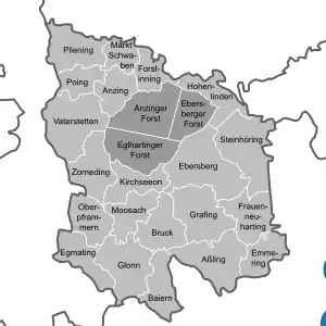 The district includes rural areas east of the city of Munich. Despite being in the vicinity of Munich, urbanisation is low. In the north there is a contiguous forest area of 80 km², serving as a recreation area for the population of the Bavarian capital. The forest consists of three separate unincorporated areas, Anzinger Forst, Ebersberger Forst, and Eglhartinger Forst.