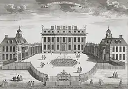 Buckingham House, the mansion that now forms the core of Buckingham Palace, was built in 1703 by John Sheffield, 1st Duke of Buckingham and Normanby to the design of William Winde.[14] In 1761 the mansion returned to the ownership of the royal family (which had retained the adjoining site of the Mulberry Garden), when it was sold to King George III,[15] for either £21,000[16] or, possibly, £28,000.[17]