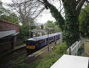 ![]() Wigan-bound Northern Electrics British Rail Class 319 EMU at Eccleston Park | |