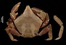 The "sea urchin crab" Echinoecus pentagonus is a species of crab in the family Pilumnidae found from the Red Sea and East Africa to French Polynesia and the Hawaiian Islands.[2] This crab is a parasite that lives in the rectum of a sea urchin. In Hawaii, it chooses only Echinothrix calamaris, leaving few of these urchins unpopulated. Its curved and pointed carapace reaches only 0.5 inches (1.3 cm) in width.[3]