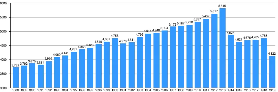 Chile's international trade collapsed and state income was reduced to half of its previous value after the start of the World War I in 1914.[93][94] The Haber process, first applied on an industrial scale in 1913 and later used as part of Germany's war effort due to its lack of access to Chilean saltpetre, ended Chile's monopoly on nitrate and led to an economic decline in Chile.[94][95][96] In addition to this the opening of Panama Canal in 1914 caused a severe drop in traffic along Chilean ports due to shifts in the maritime trade routes.[97][98][99]