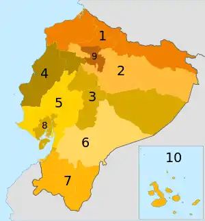 The planning zones of Ecuador are administrative organization entities made up of joint provinces or metropolitan districts in order to decentralize administrative activities of the Ecuadorian State.[1] The main agency in charge of zone planning is Senplades.