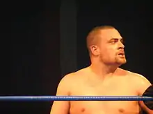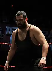 In late 2008 Kingston would team up with Brodie Lee and Grizzly Redwood to form an alliance that would later be named The Roughnecks.[4] In early 2009 The Roughnecks defeated the Order of the Neo-Solar Temple (UltraMantis Black, Crossbones and Sami Callihan) to advance to the 2009 King of Trios, where they ended up being eliminated in the first round by Team Uppercut (Claudio Castagnoli, Bryan Danielson and Dave Taylor).[4] Following the loss Kingston started a feud with Castagnoli, claiming that he had been embarrassed and disrespected.[4] On May 24, 2009, at Aniversario Yang Kingston, who had claimed to being able to outwrestle Castagnoli, pinned him cleanly with an Oklahoma roll.[4] After Castagnoli defeated Kingston via countout at the 2009 Young Lions Cup,[4] the two of them were booked in a "Respect Match" at the season eight finale Three-Fisted Tales, where the loser of the match had to show respect to the winner. Castagnoli won the match, but instead of showing respect, Kingston laid him out with a spinning back fist, after claiming that both him and his former tag team partner (Chris Hero) are shady and deserve respect from no one.[17] At the end of the event Kingston's suspicions about Castagnoli were proven right as he turned rudo and formed the stable Bruderschaft des Kreuzes (BDK).[17]