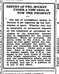 - ↑ "Return of Pro Hockey Under A New Deal Is The Prospect". The Globe. February 13, 1917. p. 9.