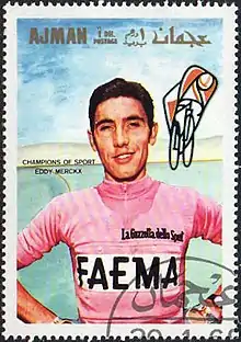 At the behest of his team, Merckx raced the Giro d'Italia instead of the Tour de France.[51] He won the race's second stage after he attacked with one kilometer to go.[52][53] The twelfth stage was marred by rainy weather and featured the climbs of the Tre Cime di Lavaredo for the stage finish.[53] By the time Merckx had reached the penultimate climb, there was a six-man group at the front of the race with a nine-minute advantage.[54] Merckx attacked and was able to get a sizable distance between himself and the group he left before he stopped to change his wheel in order to slow down due to orders from his team manager.[53][55] Merckx got back on his bike and caught the leading breakaway and rode past it to the finish, where he won the stage and took the race lead.[53][56] Merckx went on to win the race, along with the points classification and mountains classification.[53] In the Volta a Catalunya, Merckx took the race lead from Gimondi in the race's time trial stage and won the event as a whole.[57] He finished the season with 32 wins in the 129 races he entered.[58]