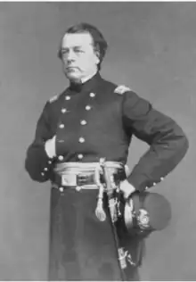 During the American Civil War, Gregory was a Union Army officer.[11] Two sons also enlisted in the army and both served until the end of the war.[5] On August 2, 1861, Gregory joined the Union Army and was made colonel of the 91st Pennsylvania Infantry Regiment.[1][11] The regiment fought in 21 battles.[5] Gregory was wounded in the leg on March 3, 1863, at Chancellorsville, Virginia.[1][11] He and his troops were attacked at Little Round Top at the Battle of Gettysburg.[12] He led during the Richmond campaign (Second Battle of Deep Bottom and/or Operations against the Weldon Railroad) in August 1864.[11] He was brevetted brigadier general on September 30[13][5][12] or October 17, 1864[11] at the Battle of Poplar Springs Church for "gallant and distinguished service."[5]