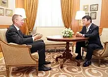 Between 1998 and 2004, Rinkēvičs was a member of the Latvian Way party.[7] In February 1998, he became involved in discussion on the US-Baltic Partnership Charter, and from 2002 to 2003 was a member of the Latvian delegation negotiating accession to NATO as Latvia's Deputy Head of Delegation. In 2008, he was appointed as Head of the Chancery of the President of Latvia, a role he held until July 2011.[7] In October of the same year, Rinkēvičs joined Valdis Dombrovskis' third cabinet as Minister of Foreign Affairs. Initially an independent, he joined the Zatlers' Reform Party in January 2012.[8] In May 2014, Rinkēvičs joined the Unity party.[9]