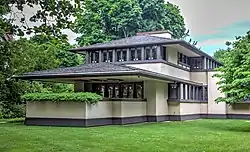 The Edward E. Boynton House (1908) was designed by Frank Lloyd Wright in Rochester, New York. This privately owned prairie-style home was commissioned by widower Edward Everett Boynton and his teenage daughter Beulah Boynton. According to Beulah Boynton (recounted to Times Union reporter William Ringle in 1955) it cost her father between $45,000 - $50,000[1] for the house, the lot and the contents - a staggering sum in 1908 (adjusted for inflation, approx. $10 million in 2021). This two-story, approximately 5,500 square foot home, was originally situated on an acre lot in the city of Rochester. Seventeen pieces of original Frank Lloyd Wright furniture remain in the house.