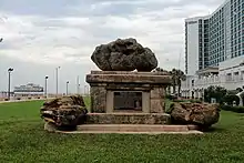 Located between the Daytona Beach Coquina Clock Tower and the Daytona Beach Bandshell in Oceanfront Park is a rather inconspicuous rectangular shaped concrete monument encased with a coquina rock veneer and three large roughly cut coquina rocks (one resting on the top and one on each of its sides) that is sitting on a concrete slab. This monument was built by the Works Progress Administration workers in 1938 to honor the man that was most responsible for the building of the Oceanfront Park complex.[2]