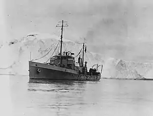 In June 1940, Smith was assigned as commanding officer of USCGC Northland while assuming duties as commander of the Greenland Patrol, which was responsible for Ice Patrol duties as well as assisting the Army and the Navy with establishing bases for the military defense of Greenland.[1] Although the Commandant of the Coast Guard, Admiral Russell R. Waesche, wanted to discontinue the Ice Patrol activities for the 1941 season, it was suggested by President Franklin D. Roosevelt that the Ice Patrol might be a good cover for investigating reports that the German Navy might be attempting to establish weather stations along Greenland's eastern coast.[16] As part of an agreement with the government of Denmark, Smith organized the Danish and Eskimo manned Northeast Greenland Sledge Patrol to patrol the eastern shores of Greenland in an effort to detect German weather stations.[17] Smith was named as Commander, Northeast Greenland Patrol which consisted of USCGC Bear and USCGC North Star as well as Northland.[1][4] In early September 1941, the Sledge Patrol reported the position of a vessel that had landed men in Greenland. Northland made contact with the Norwegian sealer Buskoe and put a prize crew aboard. A shore party from Northland located an unauthorized radio station manned by a shore party of four from Buskoe. Buskoe was towed to Boston by Bear and the crew of Buskoe were charged as illegal immigrants and not as prisoners of war because the United States was not at war at the time.[16][18]
