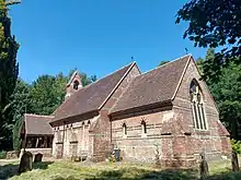 Holy Trinity, the Anglican parish church at Ebernoe, West Sussex, was built at a cost of £1200 of polychrome local brick with an open belfry and steep boarded roof between 1865 and 1867.[7] W.R. Peachey, lord of the manor, laid the foundations stone at the east end. There are no aisles. There are lancet windows in the nave and chancel, the lancets at the west end being trefoiled. The east and west windows have tracery, and there are foliage corbels on the chancel arch. It had a plain interior which was later whitened.[27]