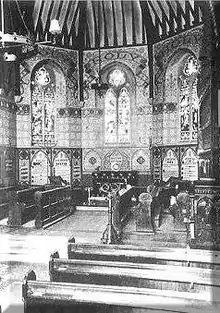 The foundation stone of St Andrews Church, Queens Road, Hastings, was laid in November 1869.[4] It was constructed by John Howell,[7] whose fee was £3,235.[4] It held a congregation of 2,000, and was consecrated on 30 November 1870 by Richard Durnford (1802–1895), Bishop of Chichester.[30] It was decorated with a mural by Robert Tressell in 1905.[5][31] The building survived until 1970 when it was declared unsafe and demolished between August and September of that year. One panel of Tressell's mural was saved, and is now in Hastings Museum.[30][32] The mural is the Islamic-style decorative work covering the walls around the windows at the east end (see image, right).